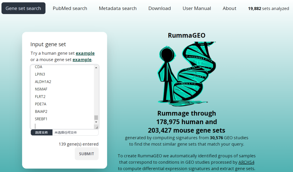 RummaGEO(https://rummageo.com/):这是一个网络服务器应用程序,可以对存储在GEO中的所有人类和小鼠RNA-seq研究进行基因表达特征搜索。为了实现这样的搜索引擎,研究者对来自ARCHS4数据库的统一比对GEO研究,进行了离线自动条件识别,然后计算差异表达特征,并从这些特征中提取基因集。总计,RummaGEO目前包含来自30576个GEO数据集(人类178,975个和小鼠203,427个基因集)。总体而言,RummaGEO为生物医学研究界提供了一个前所未有的资源,为许多未来的研究提供了假设生成的可能性。