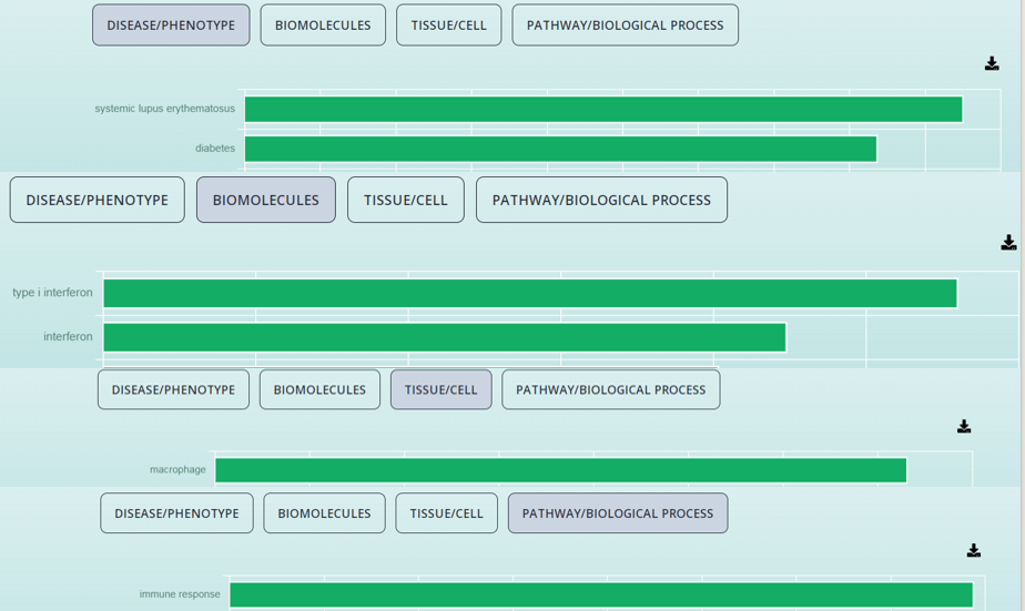 步骤6:对SLE相关的富集的前5000个GSE数据集基因进行普通富集分析。依然是四个模块,比较下与之前不加SLE筛选条件下的结果对比。如下图所示。疾病类型肯定是SLE。因为加了筛选条件。分子类型是干扰素相关的,与之前的8万富集基因集结果相同。细胞类型富集与之前的类似。但通路与生物学过程富集与之前不同。首要富集在免疫应答上,而不是凋亡中。