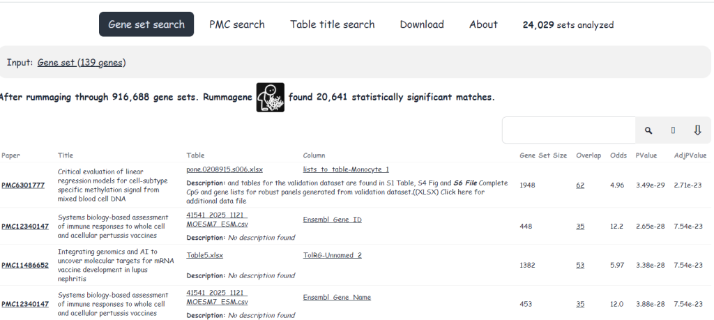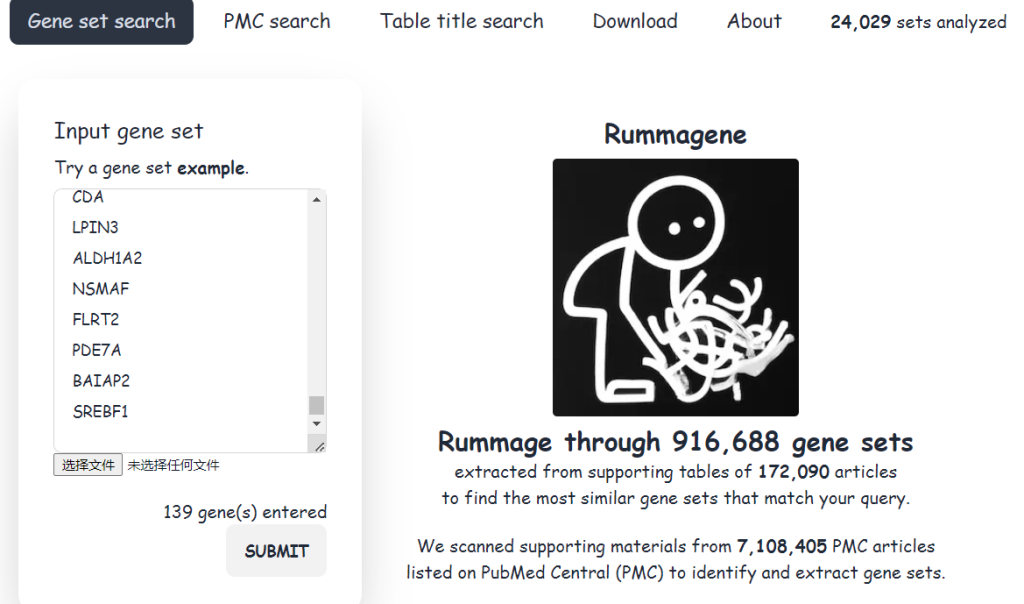 Rummagene:(https://rummagene.com/)是一个基于PubMed Central(PMC)文献的基因集挖掘与分析平台,通过自动化软bot从补充材料中提取人/鼠基因集,解决传统研究中基因数据难以检索和复用的问题。截至最新统计,平台已扫描710万篇PMC文献,识别出172,090篇含基因集的论文,累计收录916,688个基因集。核心功能包括智能检索系统(支持自由文本查询和表格标题检索,提供用户自定义基因集的相似度匹配)、多维分析工具(转录因子/激酶富集分析、单细胞RNA-seq细胞类型预测、基因功能注释推断)以及跨文献关联发现(结合基因集相似度与文本相似度,揭示生物学过程间的潜在联系)。数据更新频率为每周自动同步PMC新文献,访问方式为Web服务器,数据格式支持标准化基因列表(兼容GSEA格式导入)。