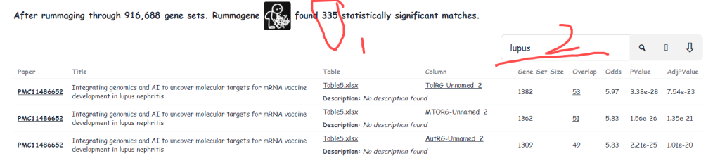步骤3:对富集的文献表格进行过滤筛选:通过关键字对表格内容进行筛选,如下图所示,lupus筛选后,只有335个表格信息。我们如果要进一步研究这些与提交基因集相关的文献与表格,可以点击Paper 的PMCID号进行查阅。