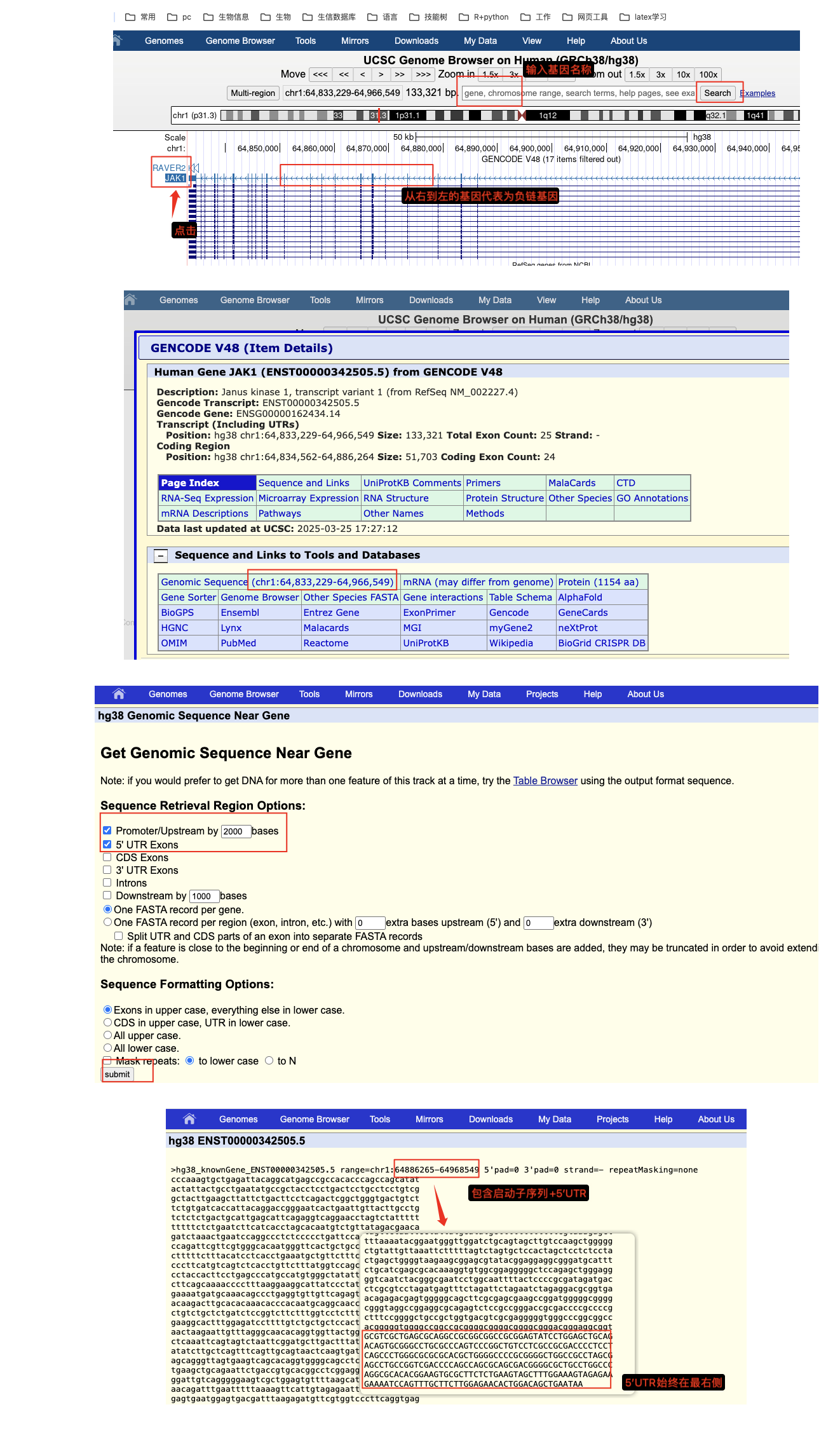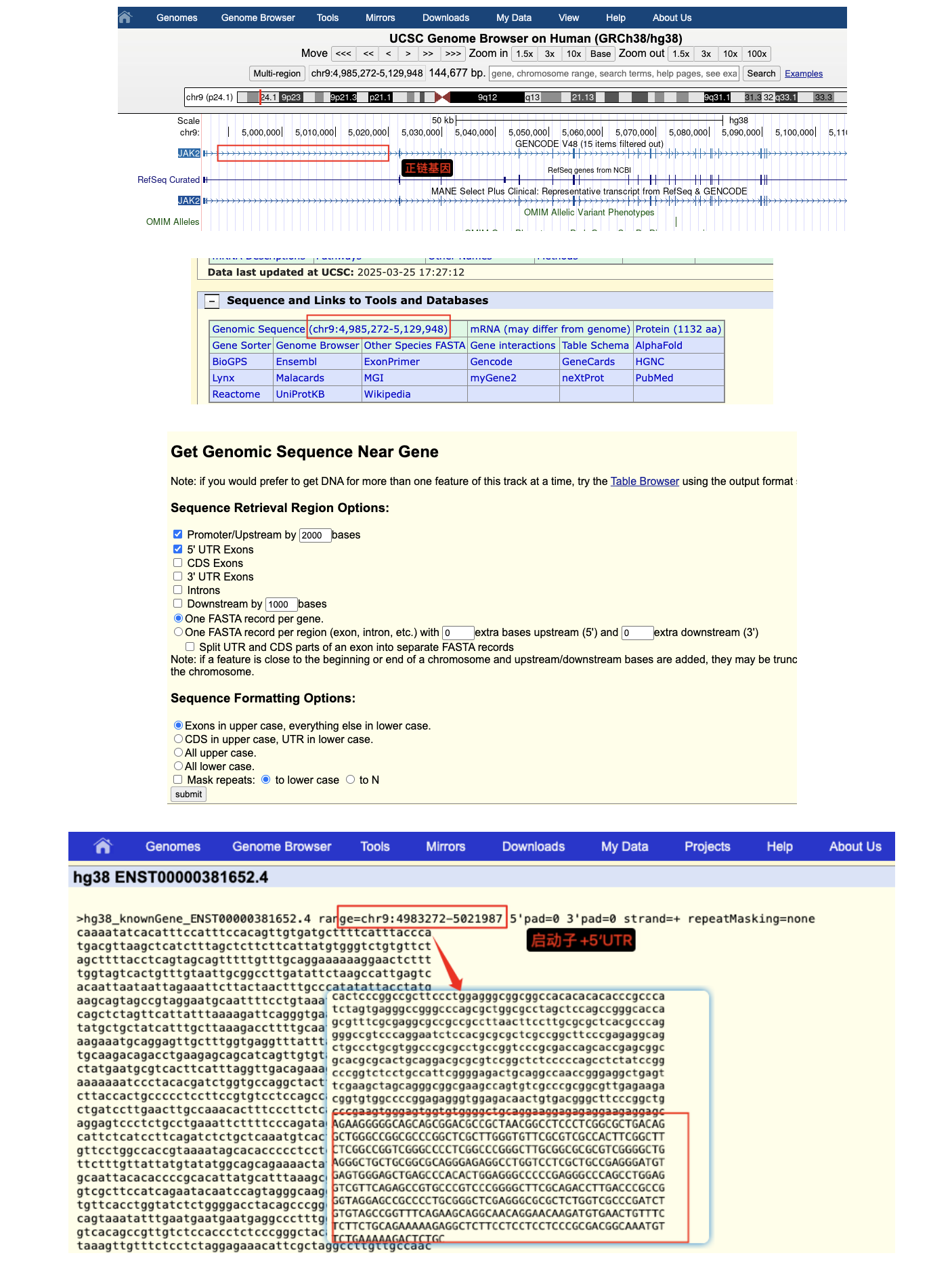 最近遇到实验室的一个需求:CHIP-PCR验证某转录因子与JAK1、JAK2基因的启动子序列是否结合,并使用NCBI primer blast设计特异性引物。前期我们需要获取JAK1、JAK2基因的启动子序列。这里介绍使用UCSC获取启动子序列的方法,更为方便。