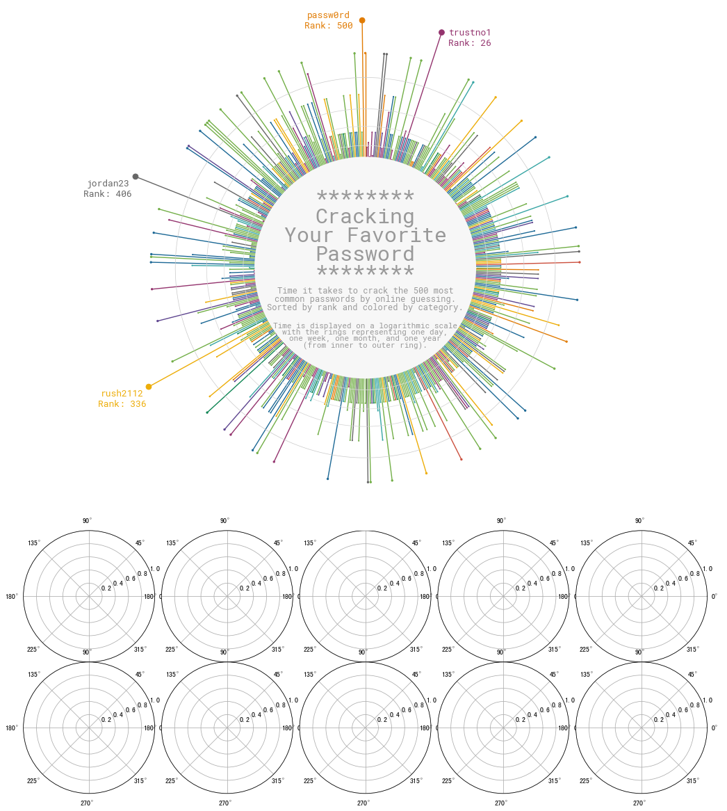 x=0.5, y=0.44, s="Time it takes to crack the 500 most\ncommon passwords by online guessing.\nSorted by rank and colored by category.",
