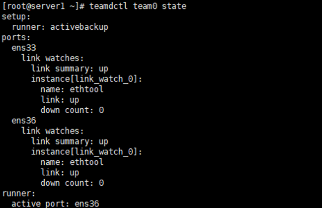 TEAM_CONFIG='{"runner": {"name":"lacp","active":true,"fast_rate":true, "tx_hash":["ipv4"], "ports":{"ens33:{}, "ens36":{}}}}'