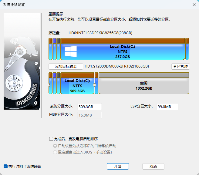 如果是系统盘(C盘)所位于的硬盘空间不足,那么就使用“系统迁移”这个功能。不仅可以把系统分区、启动相关的分区迁移到新硬盘上,还可以将非系统分区一起迁移到目标盘上。整个操作过程对原始系统是只读操作,迁移系统完成后,旧盘和新盘上的系统均能启动 (具体想要从哪个盘启动,自己在BIOS设置一下启动顺序即可。)