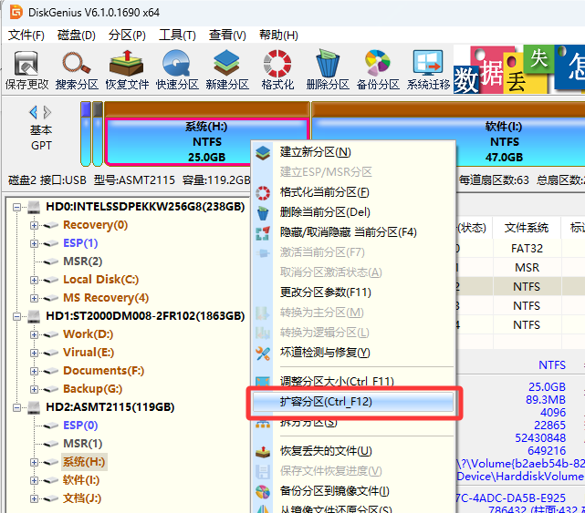 1. 选择市场上信誉良好、功能强大、免费的分区工具,例如,DiskGenius免费版。 打开软件后,找到想要扩容的分区,右击这个分区,然后选择“扩容分区”。