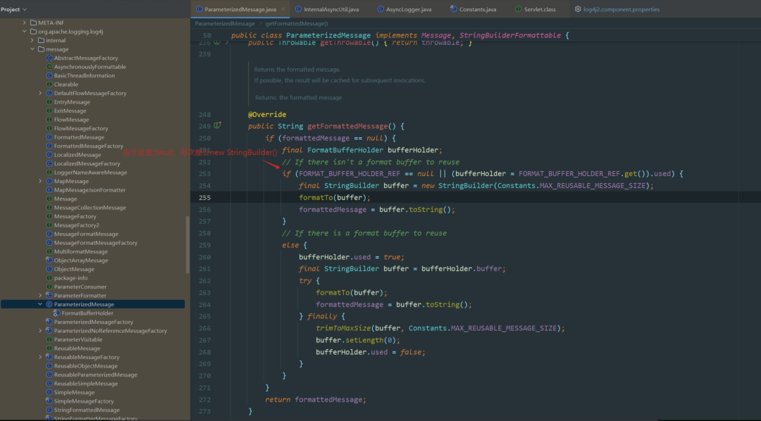 可以看到这里log4j2.enable.threadlocals=false或者被判定isWebApp的话 都会使得FORMAT_BUFFER_HOLDER_REF为null,最终每次都会new StringBuilder()创建大对象: