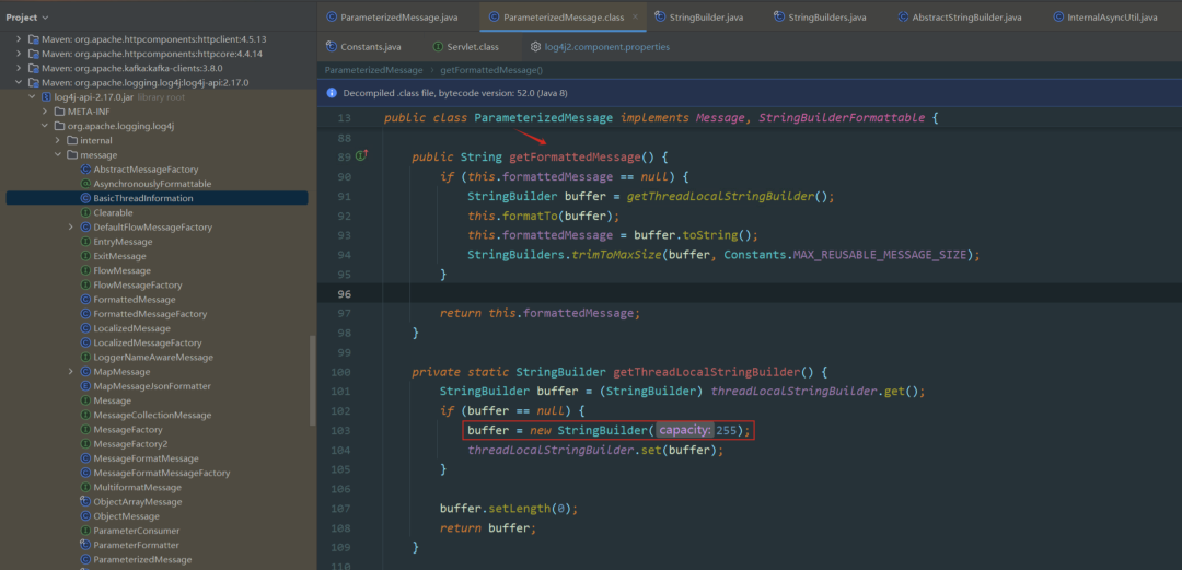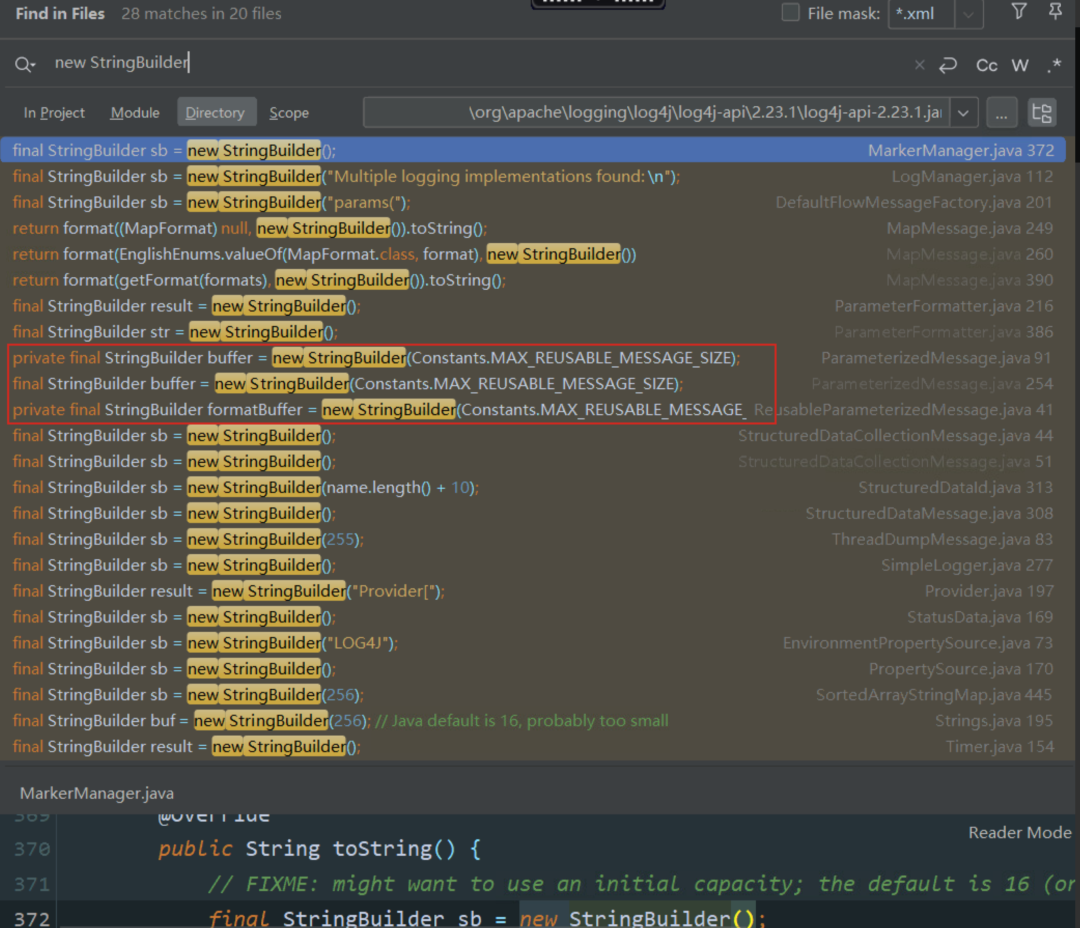 该问题同1.1,默认缓存大小为0.5k,即使顶格分配也不会出现问题。上面查看log4j2 2.23.1版本的源码,每次都按照maxResuableMsgSize配置顶格创建对应的StringBuilder缓存。这个改动是从2.17.0版本之后修改的,我们再看下2.17.0版本源码的处理: