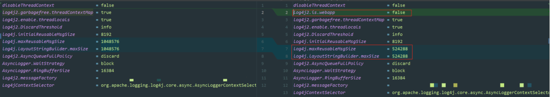 log4j2.maxReusableMsgSize | 默认 (0.5KB) | 显式配置为 1MB | 创建的对象大小不同 |