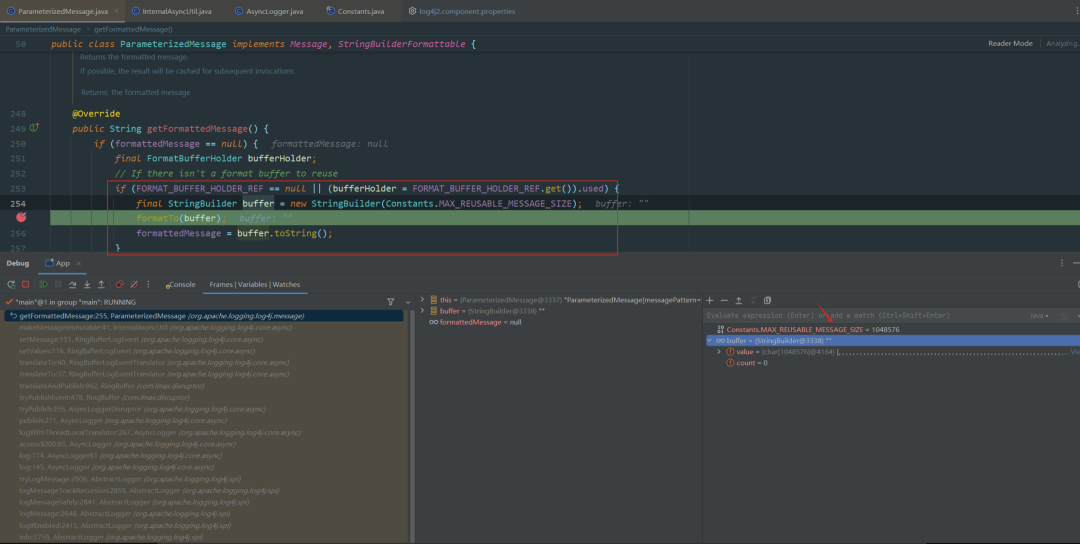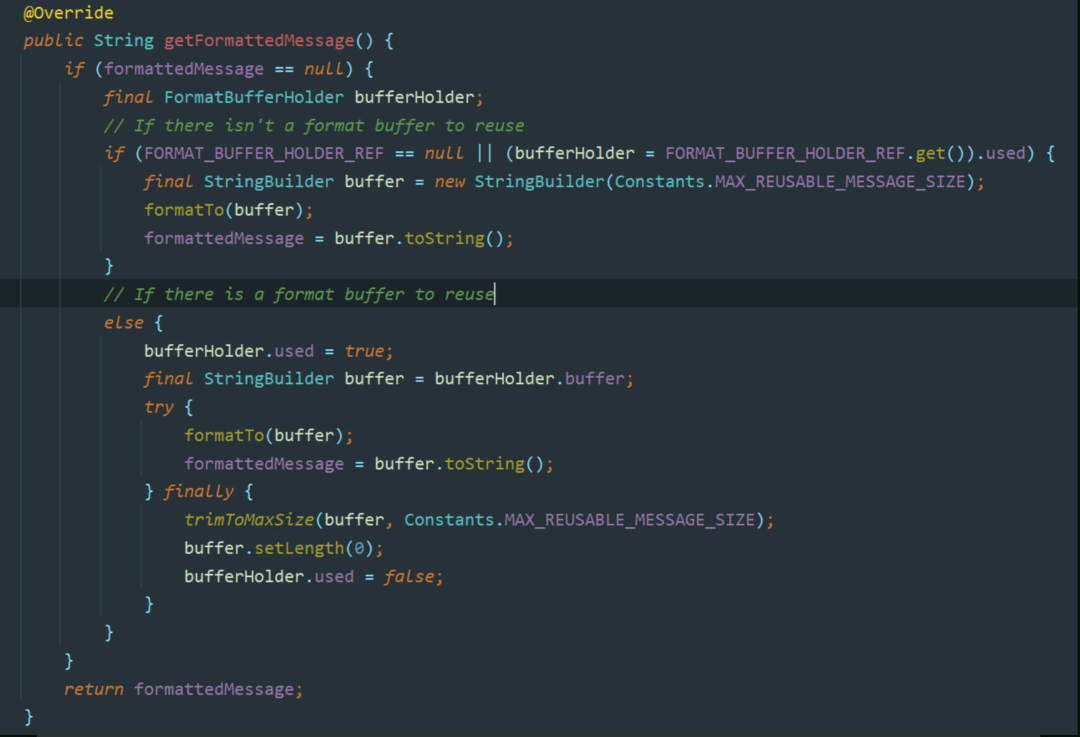 这个问题的核心在于解释下面的代码的含义,以及log4j2.maxReusableMsgSize、log4j2.enable.threadlocals等配置的意义: