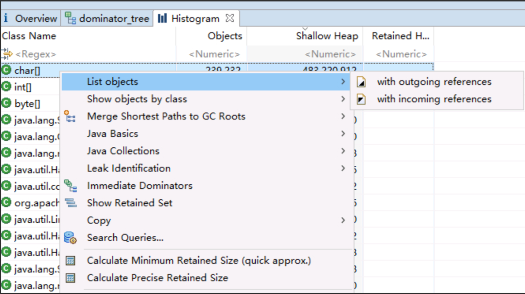 这里看到char数组和String数量最多,而且占用的内存也是最高的。这通常意味着问题与大量的字符串处理操作有关,例如日志、JSON 序列化/反序列化等。看下char[]数组关联的引用: