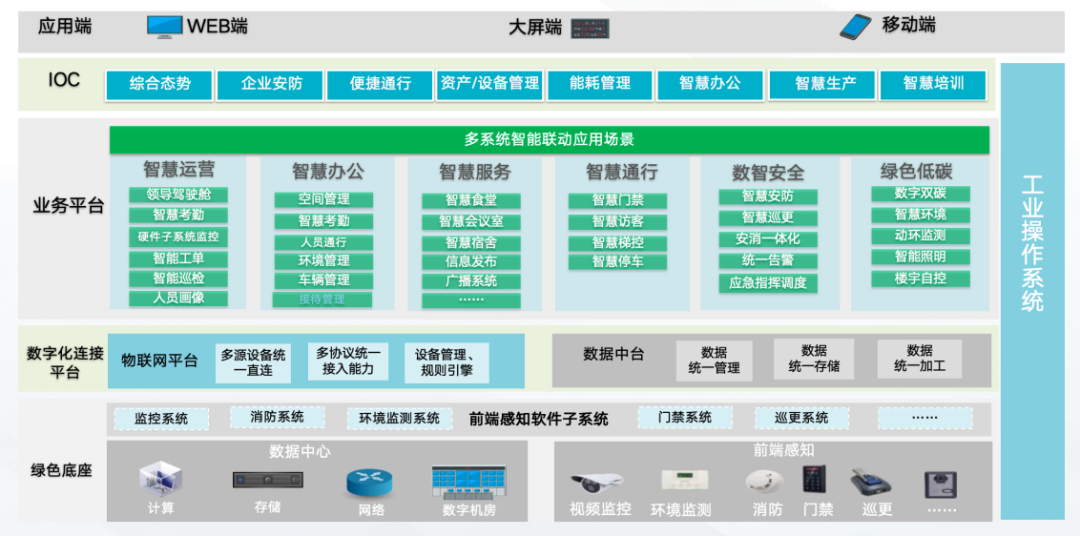 智慧园区以数字化连接平台为核心枢纽,向上支撑业务应用层创新,向下整合感知设备与子系统,通过“对下-平台-对上”三层级集成,实现数据、能力、业务的深度融合。通过拉通设备、数据、业务全链路,打破子系统壁垒,实现园区能源流 “可视(数据全维呈现)、可管(节能流程可控)、可控(节能策略可执行)”的智慧化运营目标,为园区全场景低碳应用筑牢技术底座。
