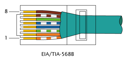 EIA/TIA 568B的线序定义依次为橙白、橙、绿白、蓝、蓝白、绿、棕白、棕(从序号1开始)