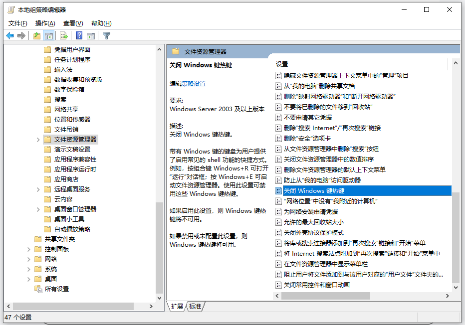 【用户配置】→【管理模板】→【Windows组件】→【文件资源管理器】