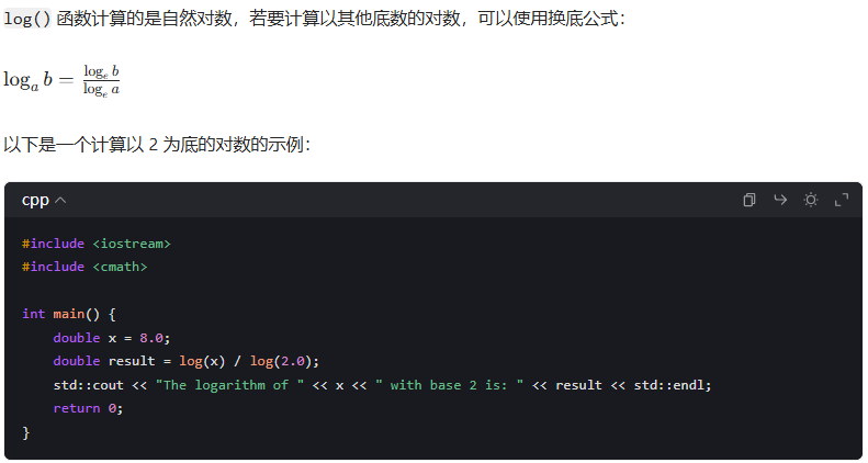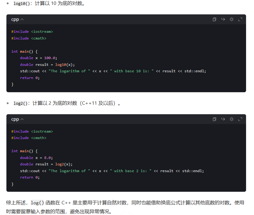 除了 log() 函数,<cmath> 头文件还提供了其他对数相关的函数:(C++11及之后适用)