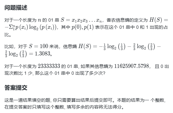 /* 但是前提条件之一是,你要知道log的用法 =底数;<cmath> C++中,log默认是 ln(..) ,要做到log(真数,指数的底数),这一步, 需要用换底公式:=ln(真数)/ln(指数的底数) 这涉及到,数学中的指数式 与 对数的转换 细节:log(float/double) 内部只能传递这两种类型,传出也是,否则也会被隐式转换 */ /* 本题的式子,都给的这么明显了,怎么可能还搞不出来? H(S)= 首先是负号、然后观察 100,一个1,两个0。看出什么没? 当然是后面的对应顺序呀。共3个(1个1 1/3) (2个0 2/3)还有个数。 “ 0 出现次数比 1 少 ” 根据题意:所以0的个数一定1~23333333/2,之间的某个数字。 */