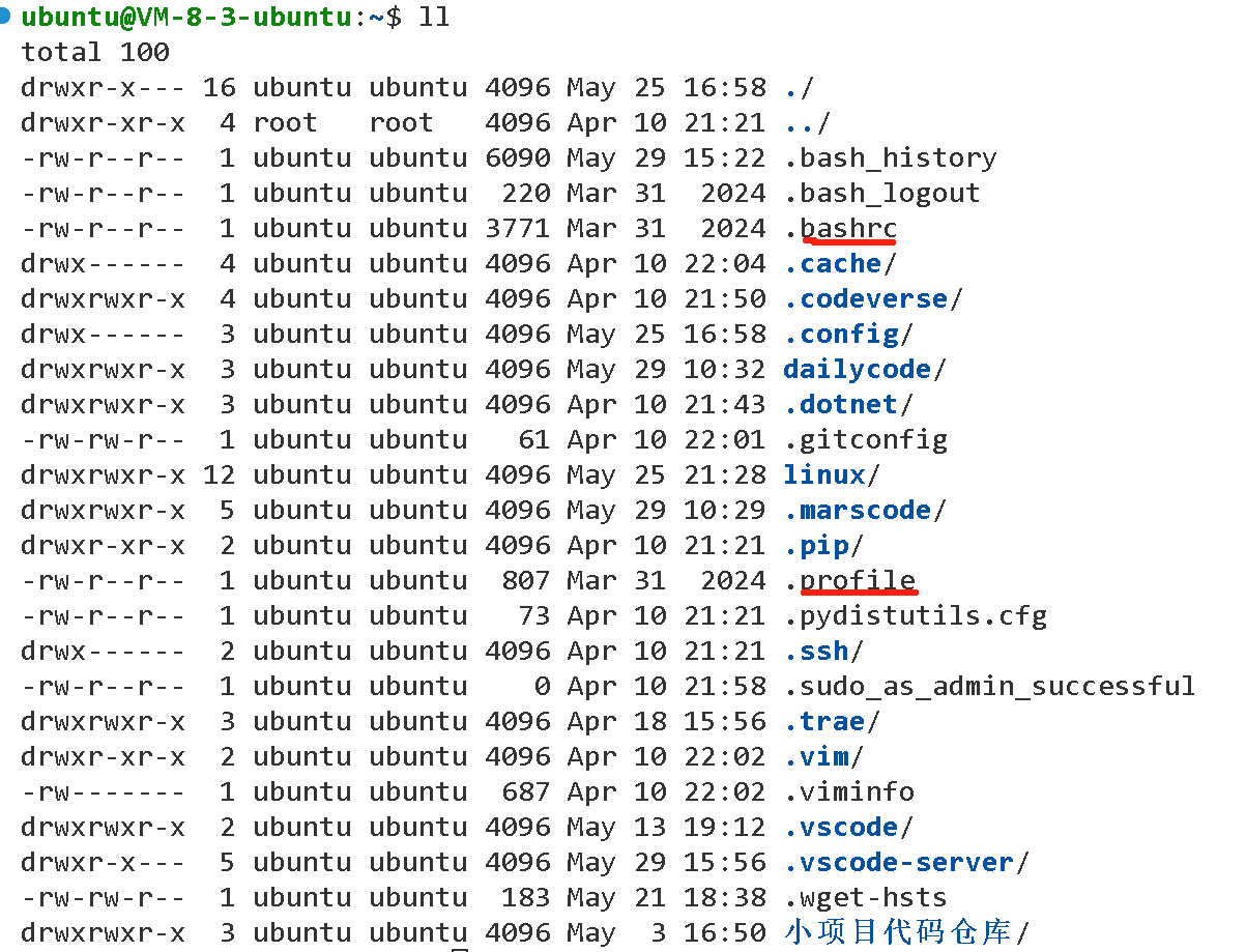 我们在自己的家目录输入 ll 指令,可以在这些文件中找到两个文件: