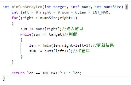 这里的len赋值INT_MAX目的是为用于fmin中选出最小的len ,fmin用于两个浮点数选出小的那一个,而最后的三目操作符意思为当len的值为INT_MAX时,返回0,否则返回len。因为当len为INT_MAX时可以认为不存在最短数组小于等于tagent,所以这里要对len的值进行判断。