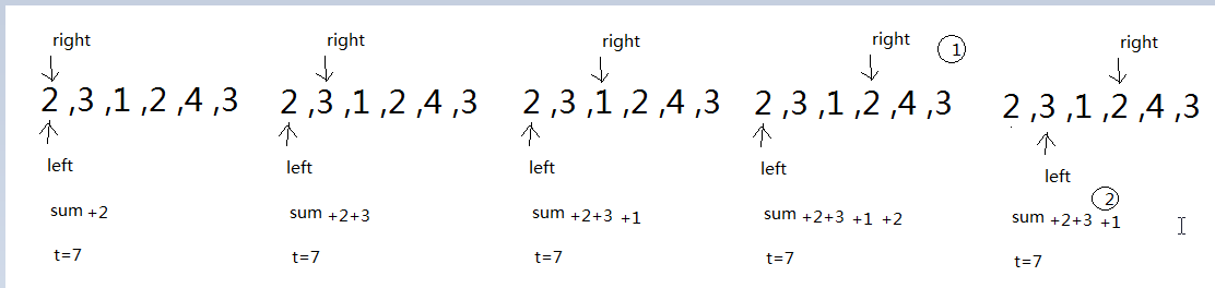 第二点呢,我们在数组的遍历中需要维护好sum的值,当left移动过后,新的sum没必要在次遍历求和,只需要在之前的基础上减去之前left指向的值即可。