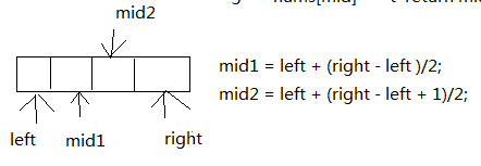 这里的mid做了防溢出处理的,避免数据过大超过int,还有另一种形式int mid = left + (right - left+ 1)/2;这里加一操作对数据个数为奇数时没有影响,当数据为偶数时,二分点有两个,上面没加一的mid是靠近left的那个二分点,而加一的mid则是靠近right的按个二分点。
