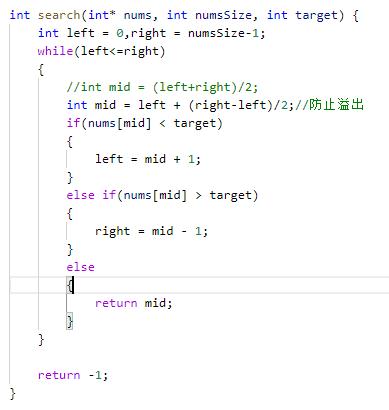 由于是循环进行的,所以我们还需要确定循环的条件。当left == right时,nums[mid]也是需要判断的,所以循环条件是left<=right,循环结束的条件则是left>right
