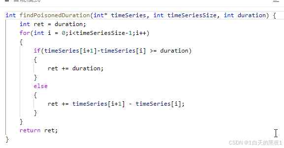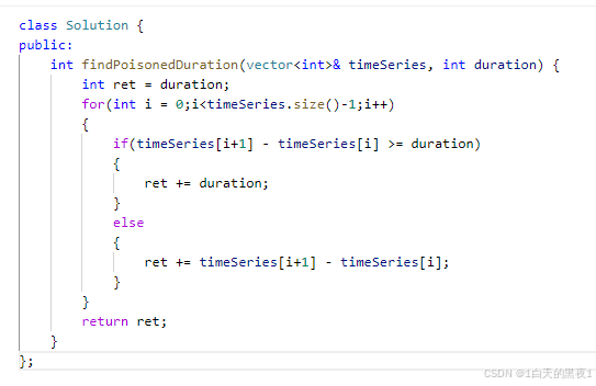 这里我们需要一个ret来记录中毒的总时长,对于我们每次最后一次攻击的中毒时长都为给出的duration的值,所以为了方便我们可以给ret初始化赋值为duration,根据for循环来得到攻击的t,并计算前后两个的差值,用于判断中毒的时间。