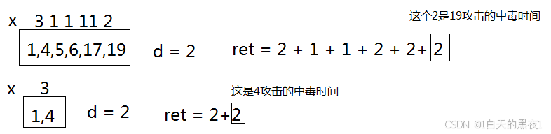 我们可以注意到给出的t是以区间的方式给出的,就像上面的[1,4]我们就可以理解为分别在1和4发动了攻击,4的时间是最好算的,因为它是最后一次攻击,所以它的持续时间就等于duration,而1发动的攻击的中毒时长会受到下一次攻击的影响,题目上说攻击可以重置中毒计时器,所以我们需要注意给出的两次攻击的间隔时间或多次攻击的其中二次的间隔时间,这里可以用x代替间隔的时间。