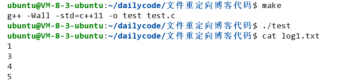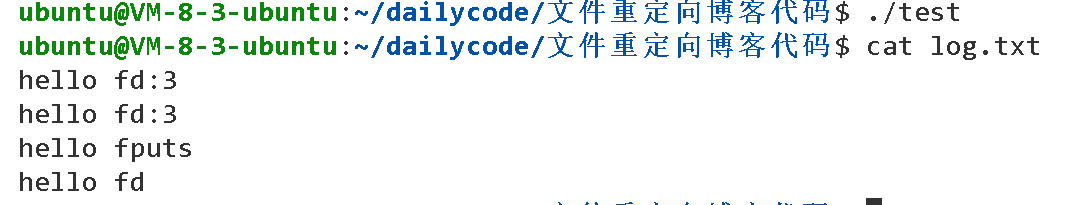 int main() { int fd=open("log.txt",O_WRONLY | O_CREAT | O_TRUNC , 0666); dup2(3,1); printf("hello fd:%d\n",fd); fprintf(stdout,"hello fd:%d\n",fd); fputs("hello fputs\n",stdout); const char *message="hello fd\n"; fwrite(message,strlen(message),1,stdout); return 0; }