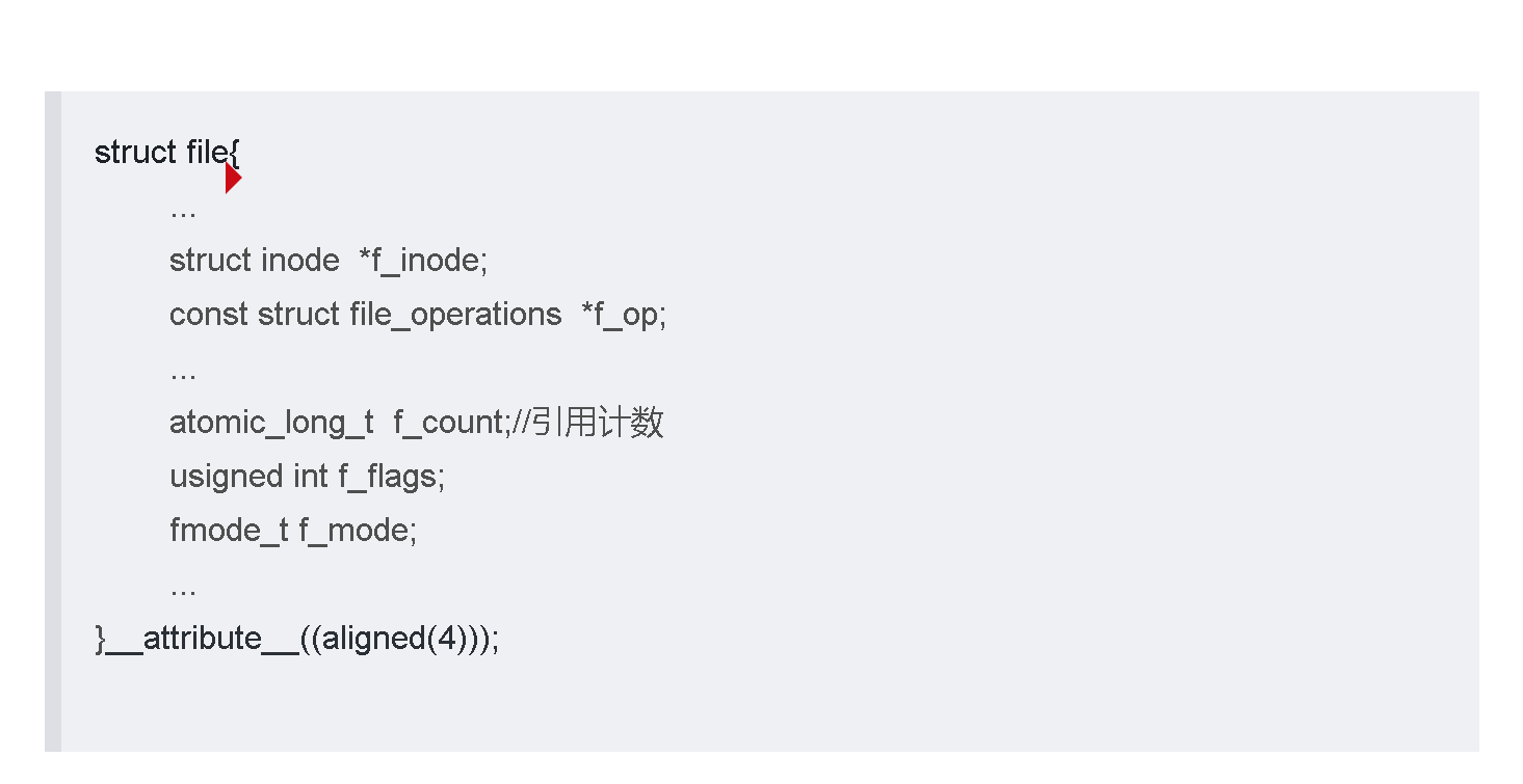 struct file{ ... struct inode *f_inode; const struct file_operations *f_op; ... atomic_long_t f_count;//引用计数 usigned int f_flags; fmode_t f_mode; ... }__attribute__((aligned(4)));