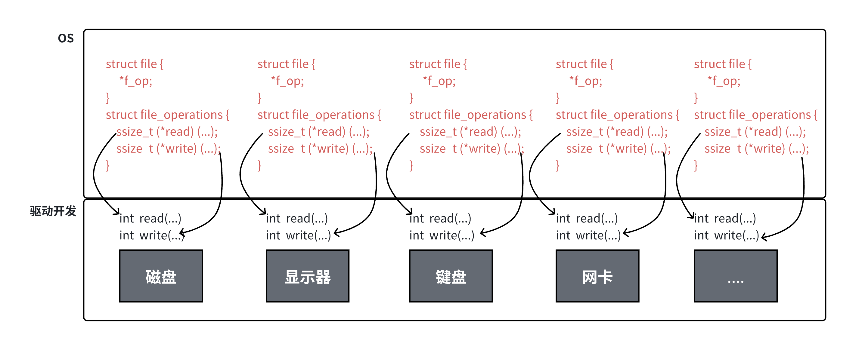 这个struct file也不简单,它里面藏着一个操作表,相当于这个设备的"技能树"。比如键盘有键盘的read方法,显示器有显示器的write方法,但对外都统一叫做read和write。这不就是面向对象里的多态吗?C++程序员看到这里应该会心一笑。