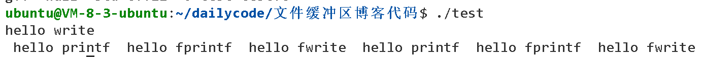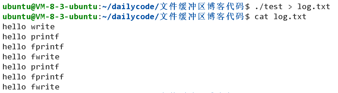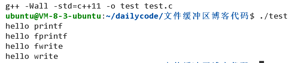 int main() { //C库函数 printf(" hello printf "); fprintf(stdout," hello fprintf "); const char*message=" hello fwrite "; fwrite(message,strlen(message),1,stdout); //系统调用 const char*w="hello write\n"; write(1,w,strlen(w)); fork(); return 0; }