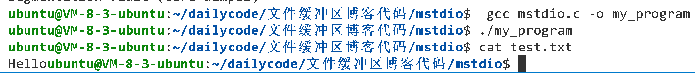 这里我们加了一个fflush之后,就可以在文件中看到我们的输出结果了。当时我们解释的是“ printf 的输出被缓冲在内存中,尚未写入文件,而程序结束时没有触发缓冲区的自动刷新。”