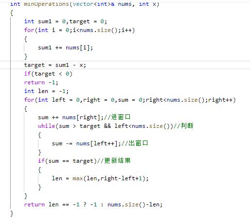 我们固定left移动right的过程我们叫做进窗口,在窗口了我们还需要做判断,判断sum是否大于target,大于我们就需要出窗口,即left向右移动,这时我们还需要一个len用于记录子数组的最大长度,由于需要返回-1,所以我们可以将len赋值为-1,最后输出结果是判断,如果len == -1,则说明没有最大子数组,返回-1,若结果不为-1,则返回与数组长度的差值。len用于更新结果,当sum==target时我们可以更新len的值。