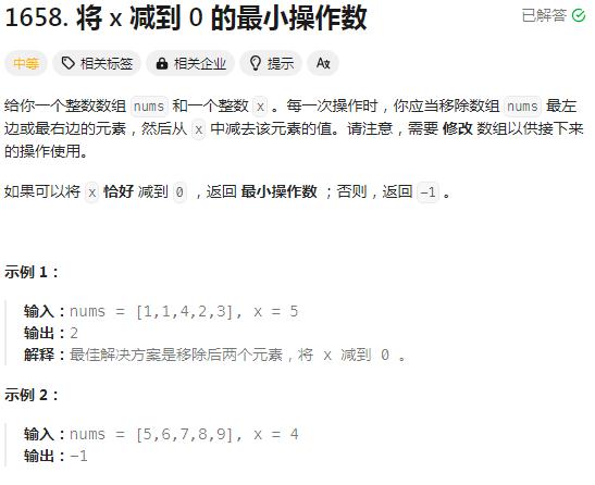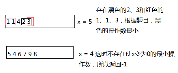 我们需要移动左边或右边的数使x变为0的操作次数最小,可以结合示例来体会该题运行的逻辑。
