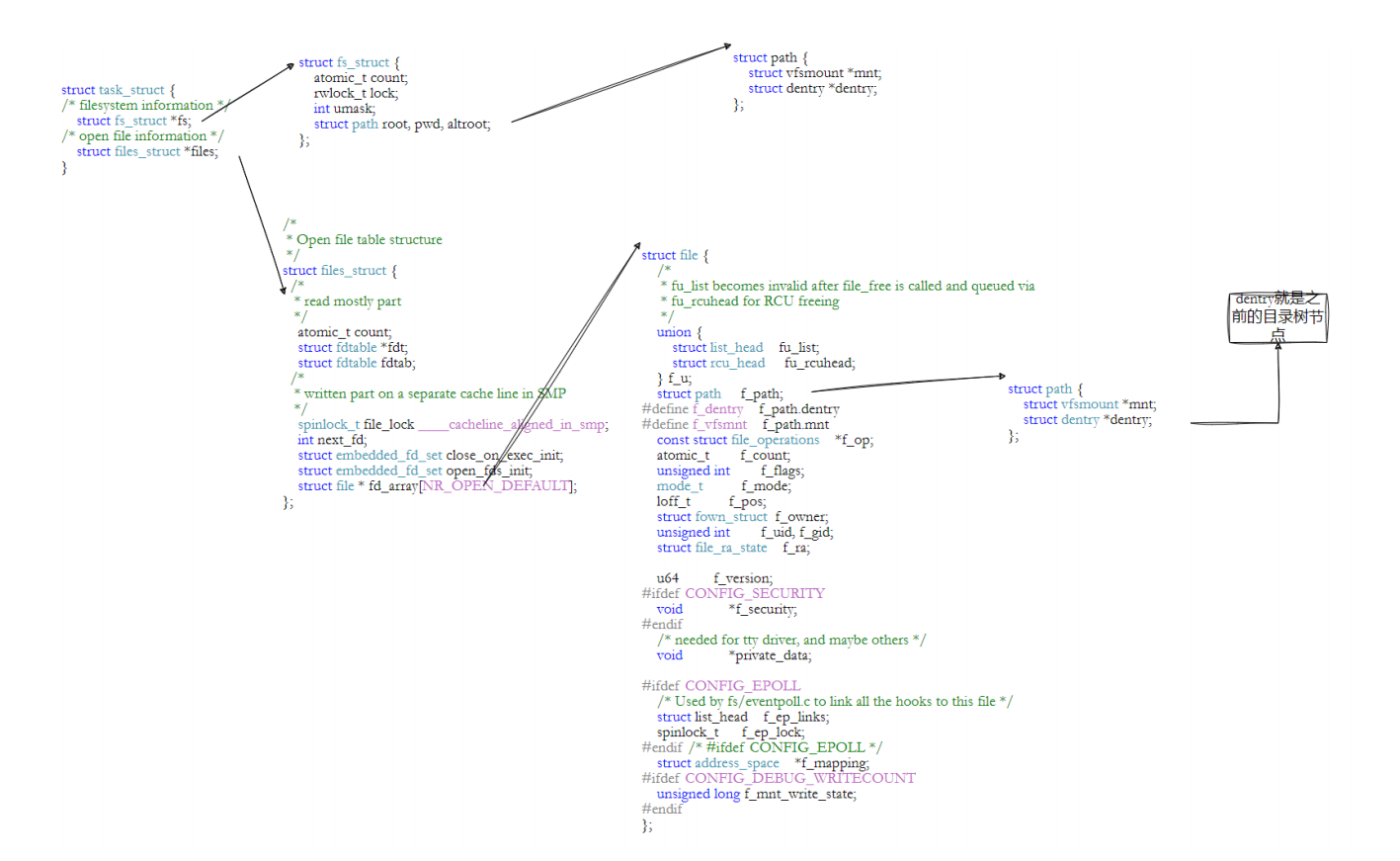 其实就是文件描述符可以找到文件,而这个文件属性中,存在struct dentry的数据结构,这个结构,记录了当前文件(可能是目录文件,也可能是普通文件)与它的inode编号的映射(因为我们有d_child与d_subdirs,这也就是为什么我们说目录中存储了当前目录下的所有文件的inode映射关系),同时,会存在