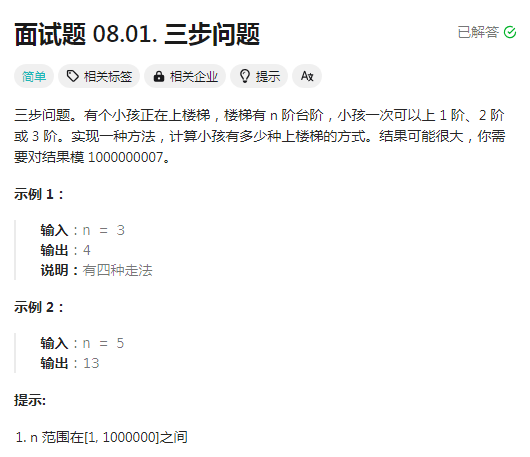 老规矩,先去自己实现结合解析,链接:面试题 08.01. 三步问题 - 力扣(LeetCode)