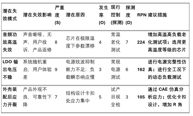 我们将RPN值超过100的风险点全部列为高风险项,并为每一项都指定了负责人和完成期限。比如,针对 “音频功放高温失效” 这一项,我们的措施是: