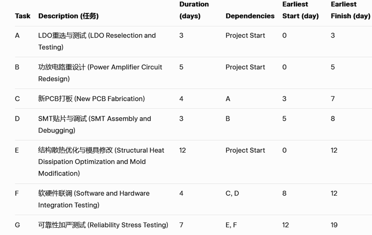 ●路径1 (硬件修改): B(5)->D(3)->F(4)->G(7)=19天(因C与B/D部分并行,取最长) ●路径2 (结构修改): E(12)->F(4) ->G(7) =23天 ●结论:路径2是关键路径。总工期由“结构散热优化与模具修改” 这个耗时最长的任务决定。