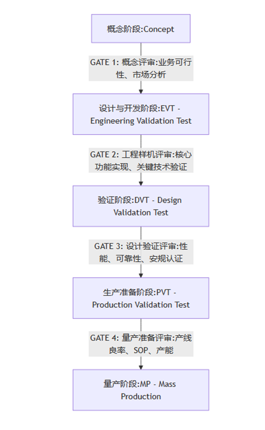 阶段门模型将项目划分为若干个明确的阶段(Stage),每个阶段之间设立一个“门”(Gate)。在每个“门” 处,项目团队必须提交预定义的交付物,由一个跨职能的评审委员会(包括研发、产品、质量、制造、采购等)依据明确的准则,做出 “Go/Kill/Hold/Recycle” (继续/终止/暂停/返工)的决策。