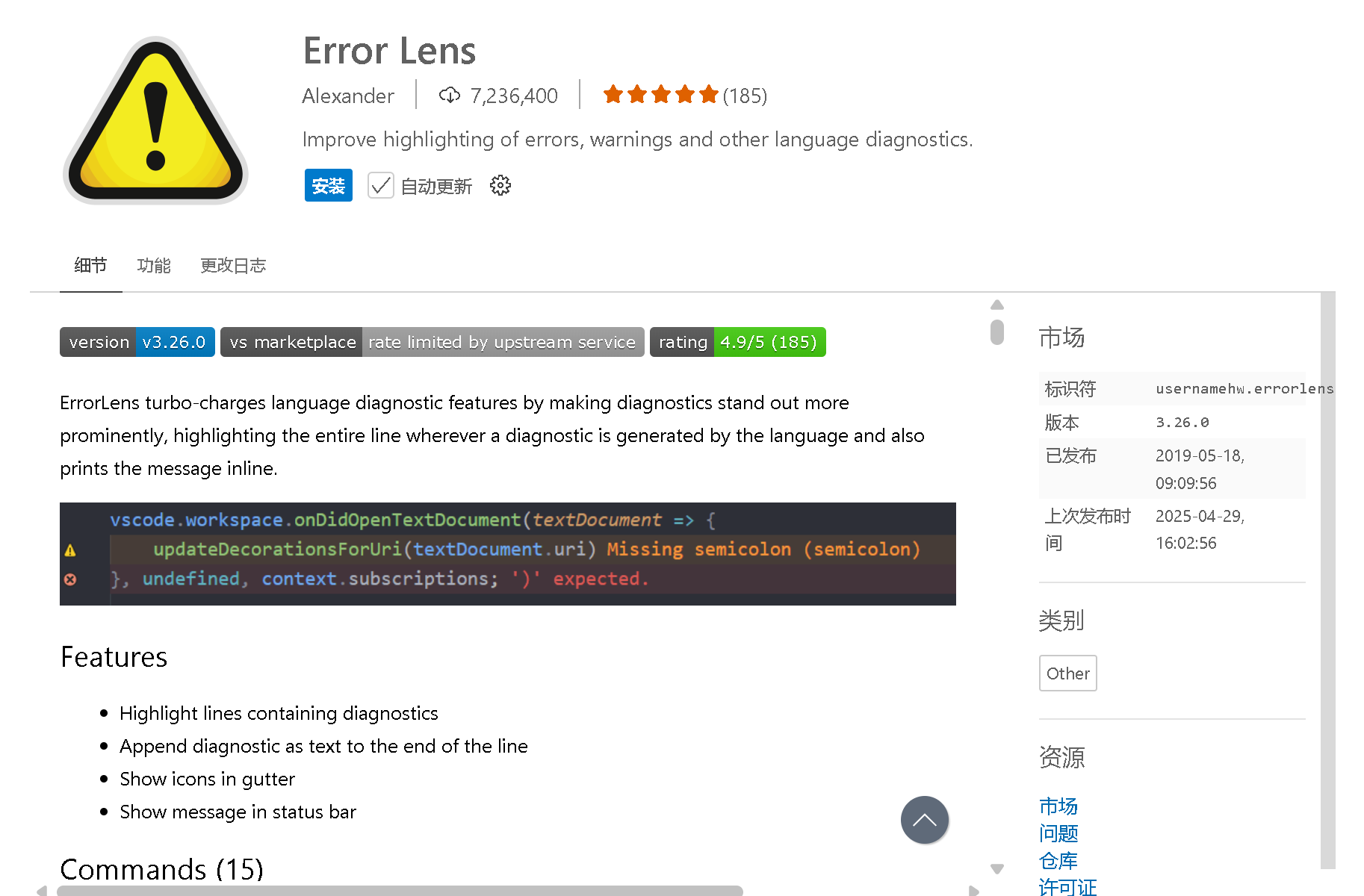 平时写代码,报错要么缩在底部的小角标,要么得等你鼠标移上去。 Error Lens 把错误和警告直接显示在行内,还能高亮,醒目到不可能忽略。