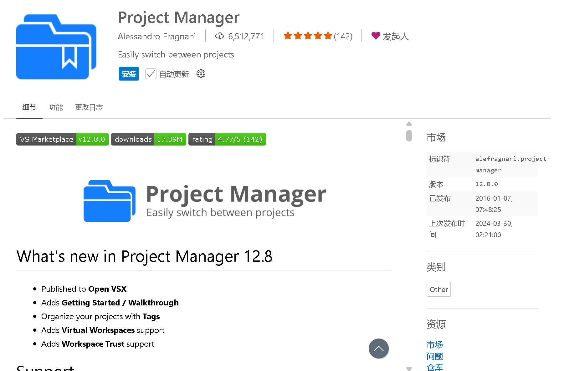 同时维护多个项目时,频繁用「打开文件夹」太麻烦。 Project Manager 可以帮你收藏常用项目,一键切换,就像 IDE 自带的「项目管理器」。