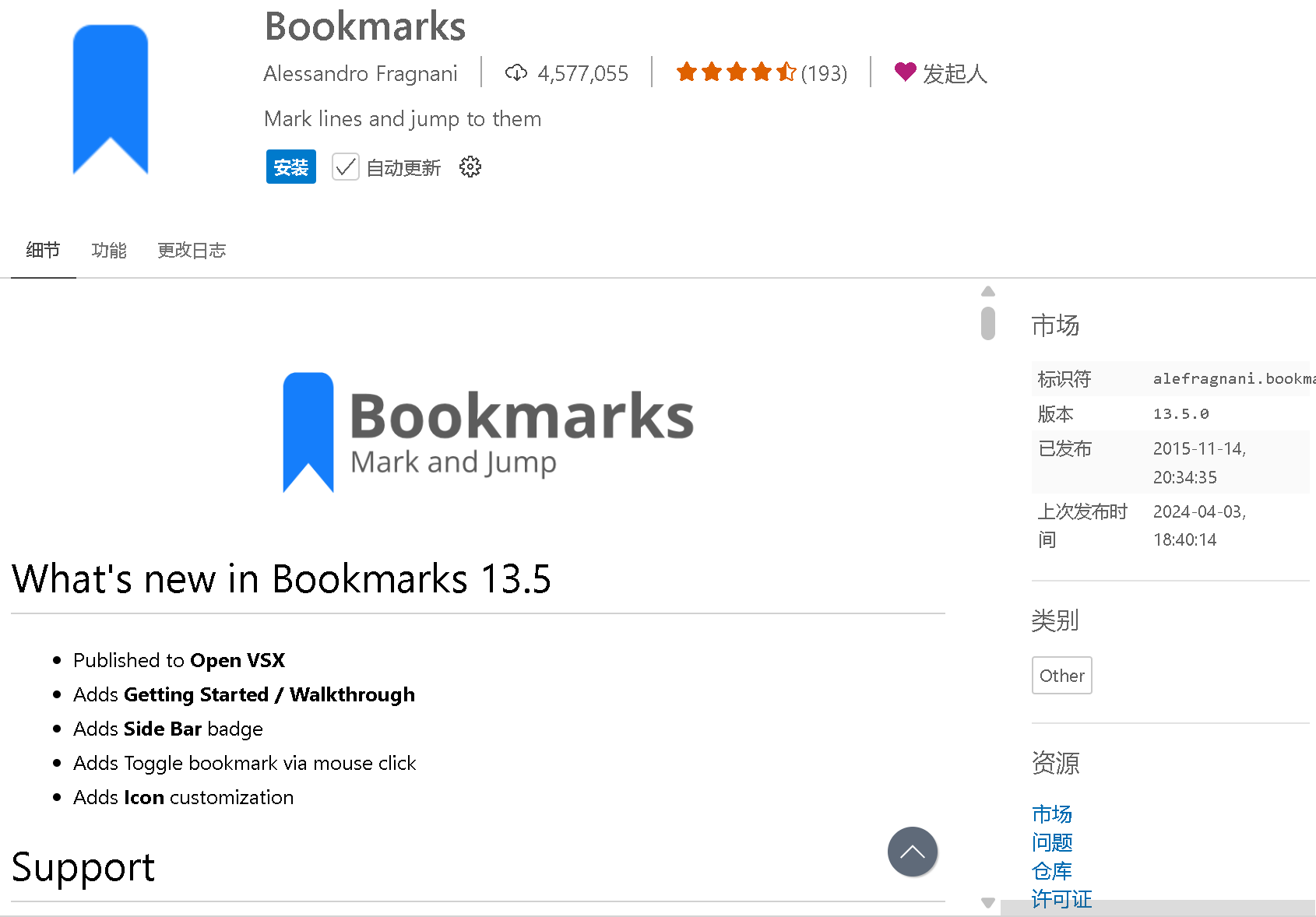 大文件里定位函数太痛苦了。 Bookmarks 可以给关键行打书签,侧边栏快速跳转。
