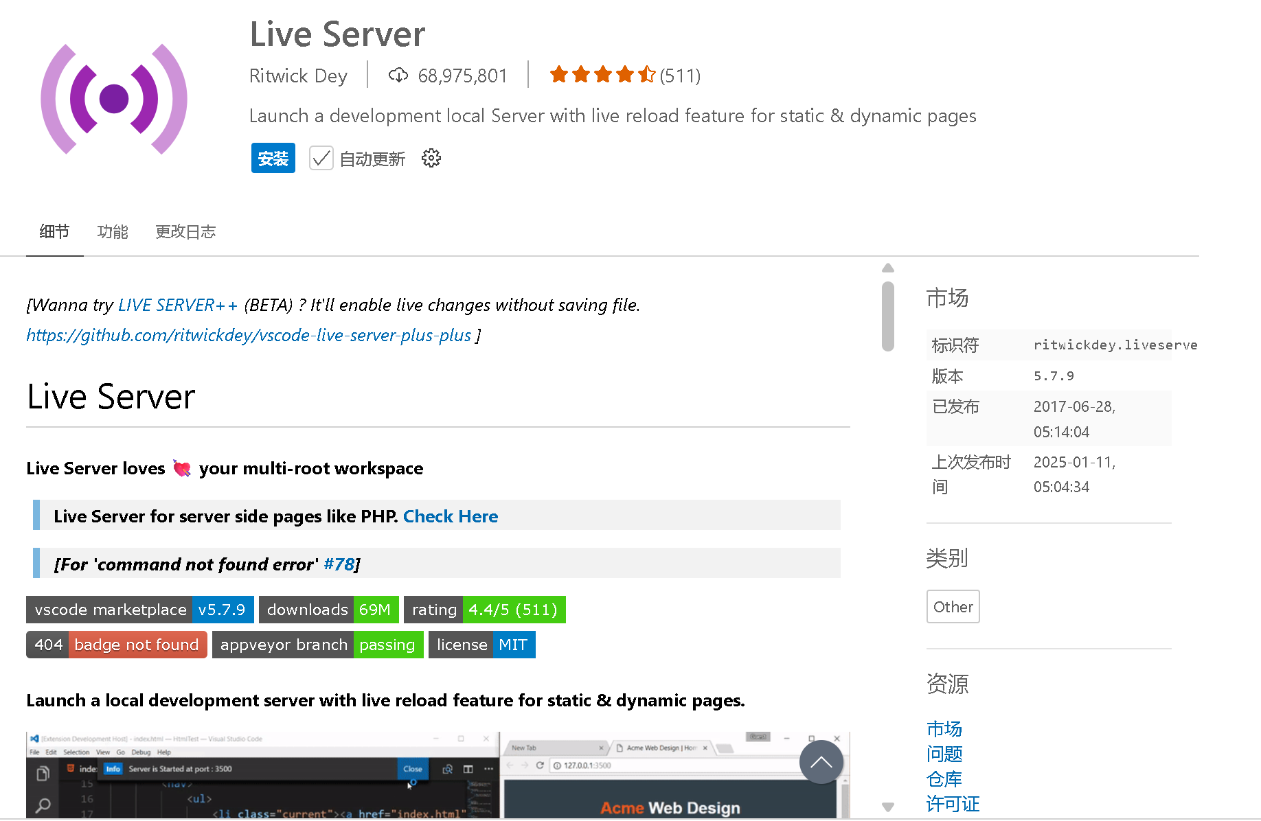 做前端的小伙伴肯定爱死这个插件。 装上之后,右下角点「Go Live」,静态页面秒开本地服务器,保存就自动刷新。