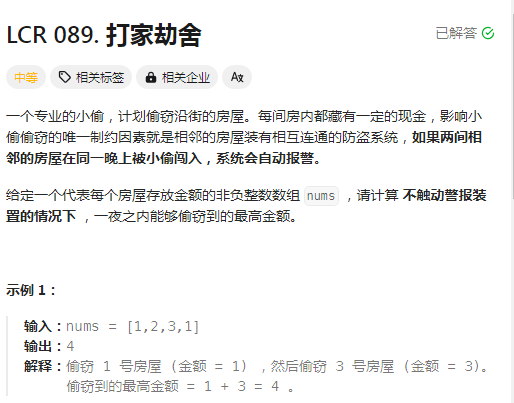 先跟着思考一番,在自己动手写代码,链接:LCR 089. 打家劫舍 - 力扣(LeetCode)