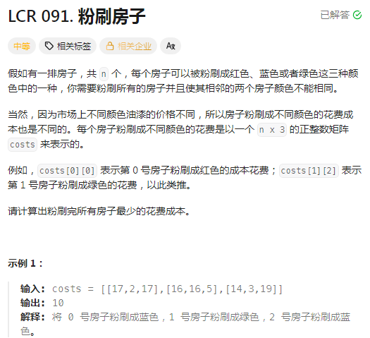 动手实现代码,才能未来助你一臂之力,链接:LCR 091. 粉刷房子 - 力扣(LeetCode)