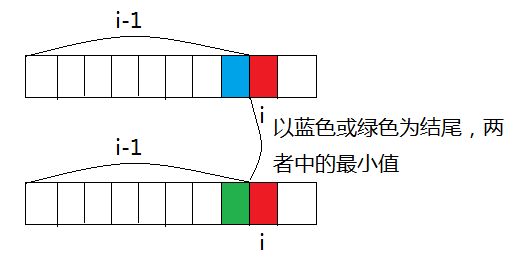 由于分析方式类似所以这里只给出以红色为结尾时的状态转移方程