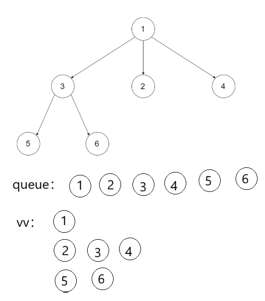 1、先创建队列用于储存入队节点,二维数组vv用于存储最终结果