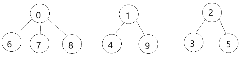 继续看例子,此时我们的新员工要去公司上班了,每个地方的学生自发组织成小分队一起前往公司,于是就有了一下小分队:重庆队s1={0,6,7,8},成都队s2={1,4,9},武汉队s3={2,3,5},10个人形成了3个小团体。假设由三个群主0,1,2担任队长,负责大家的出行。