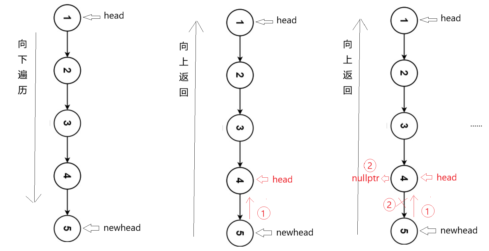 第二步,将head的next改为nullptr,完成反转,然后继续向上返回。