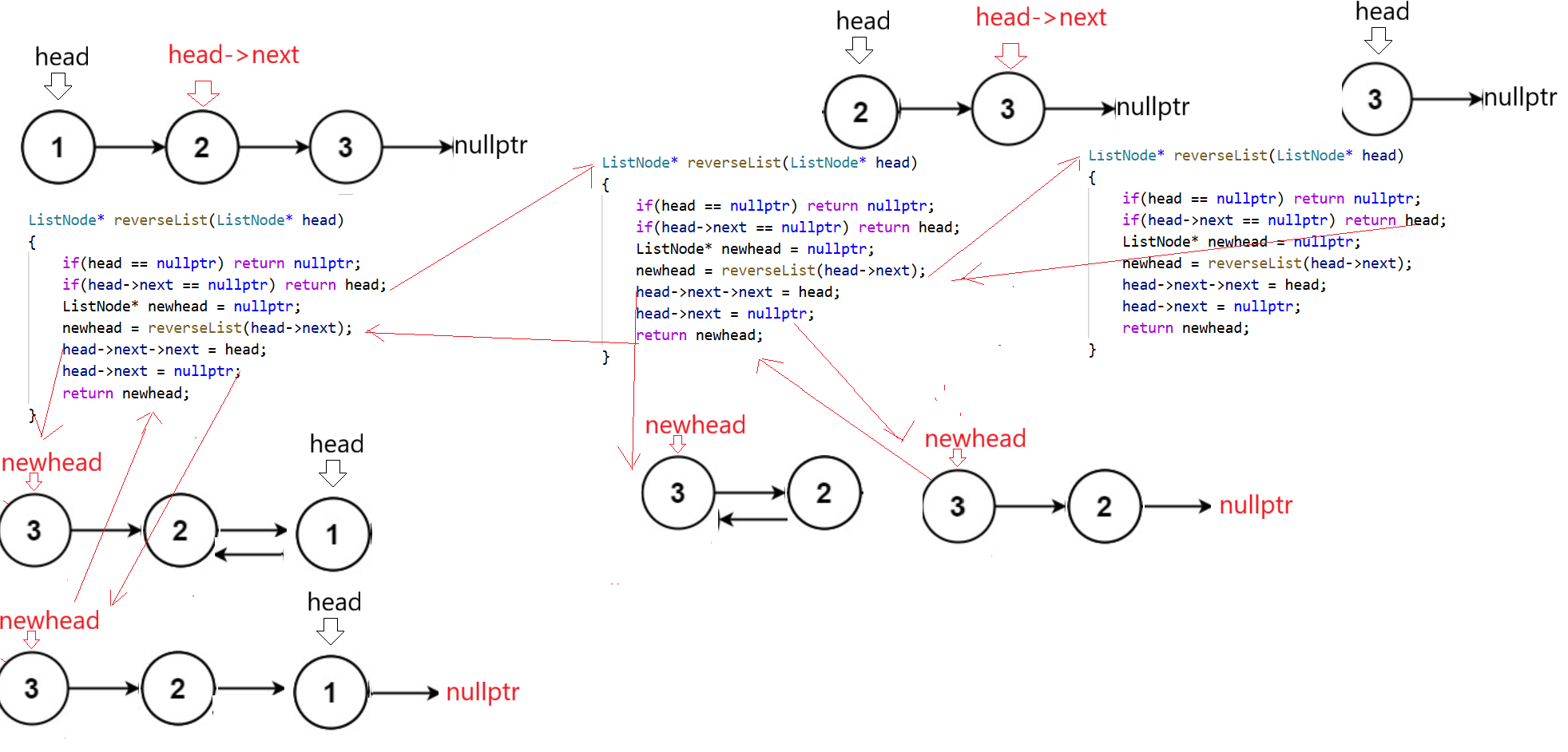 为了避免过于复杂(其实是博主懒画这么多递归展开图),使用1->2->3->nullptr为例子。
