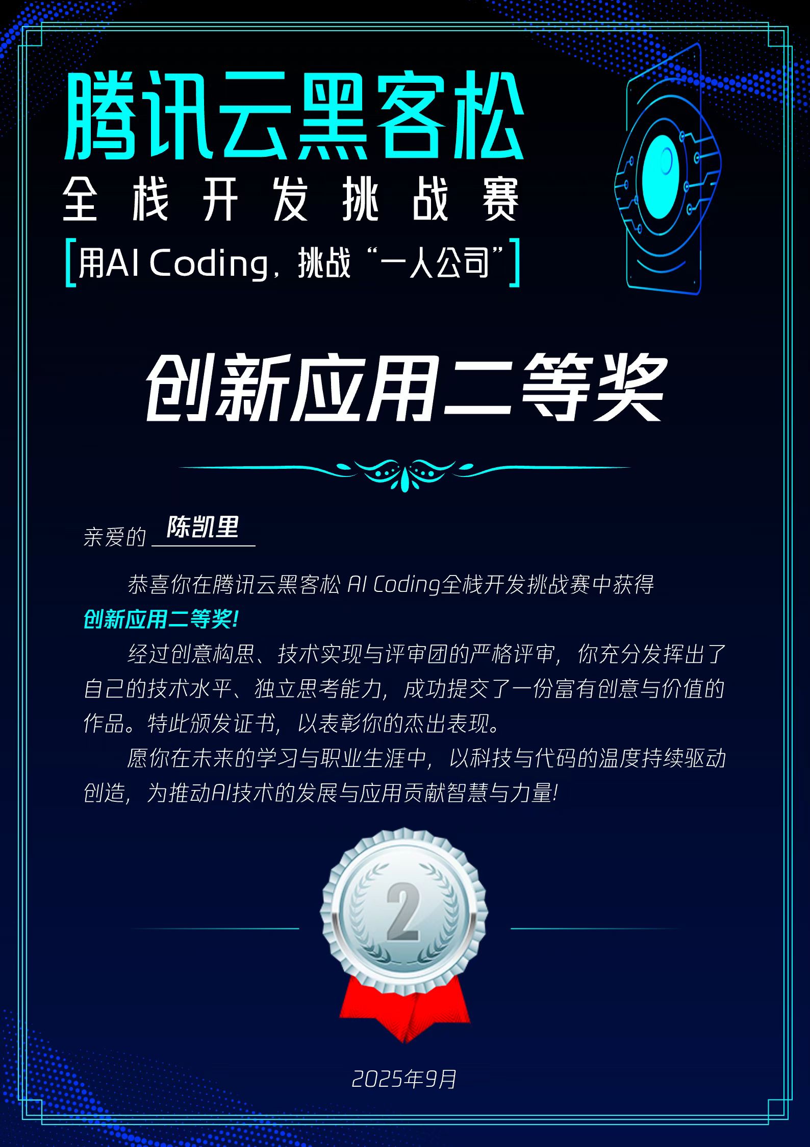团队的力量是惊人的。他们借助 AI Coding、Code Buddy 等前沿技术,仅用七天时间,就高效地完成了一个功能完整、前端优美的小程序。最终,这个项目脱颖而出,一举拿下了腾讯云创新应用奖二等奖。当时一等奖仅一名,二等奖有三名并列,含金量极高,可以说是全球Top 2的成绩。这还没完,团队再接再厉,用同样的项目参加了由 Fellow AI 和微软组织的另一场比赛,在重新打磨前端并适配框架后,再次取得了全球前九名的成绩,斩获铜奖(Bronze Medal)。